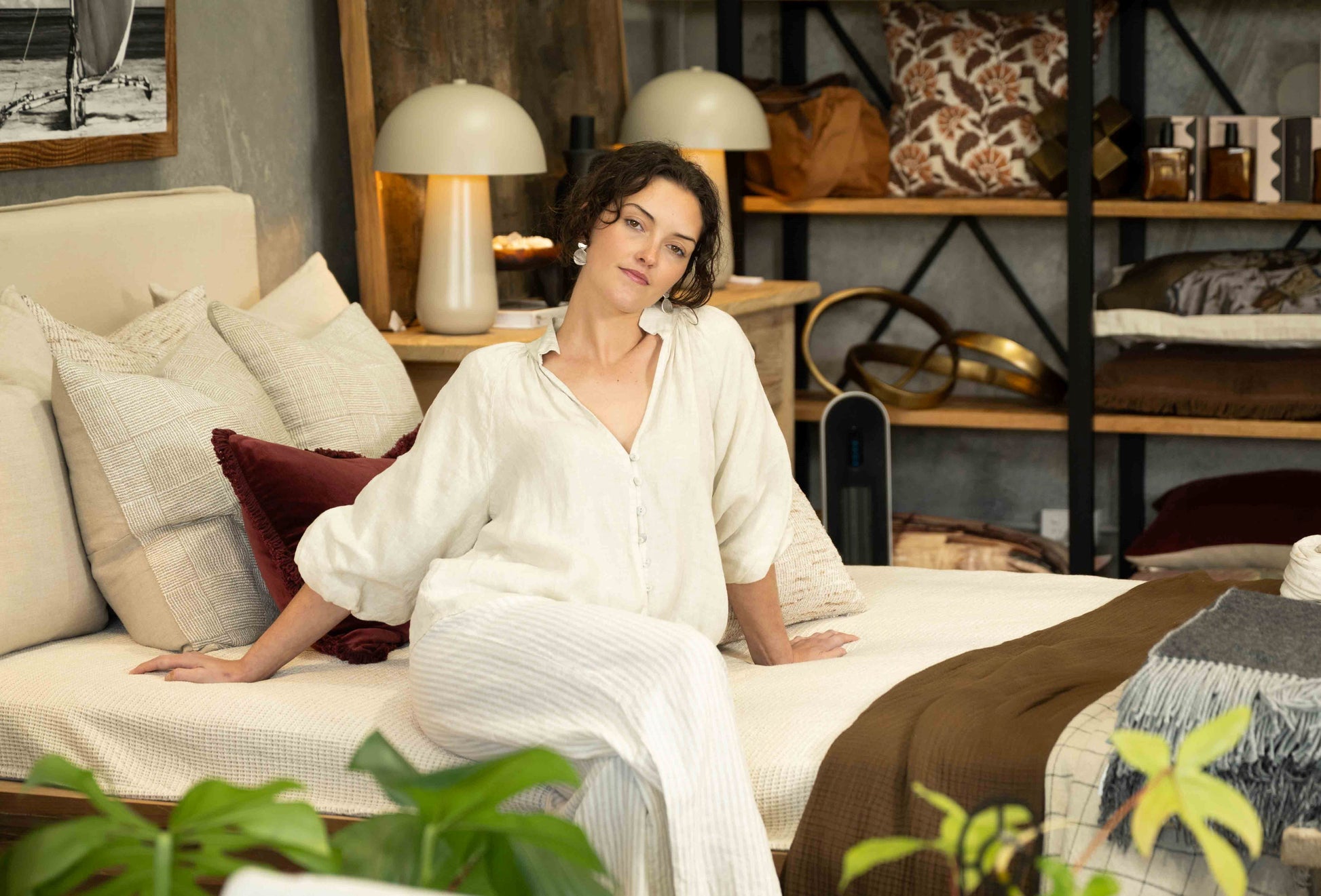 Whether styled with tailored trousers, linen shorts, or layered over a slip dress, the Cleo Top in beige moves effortlessly between moments—thoughtful, versatile, and quietly graceful.