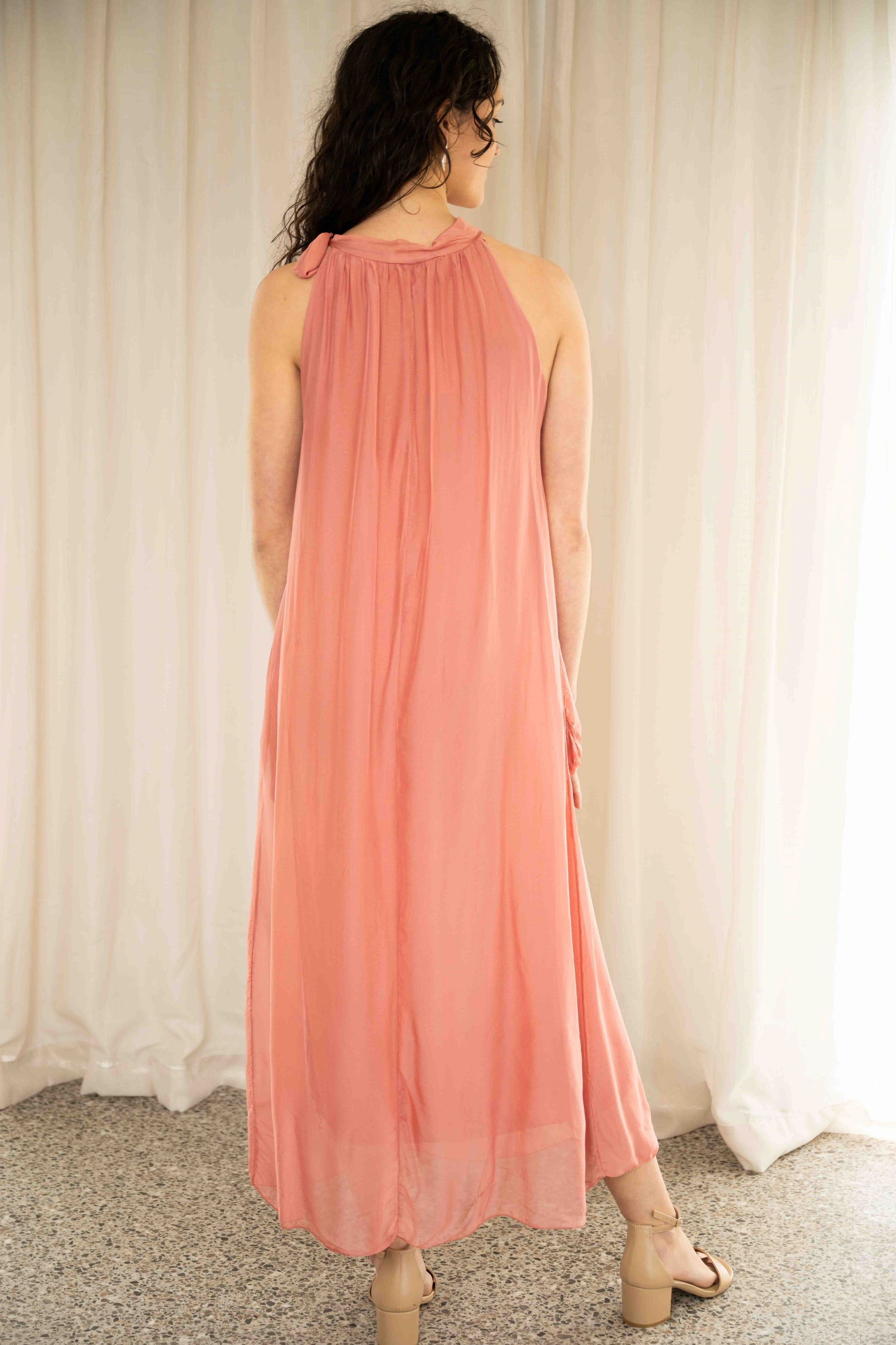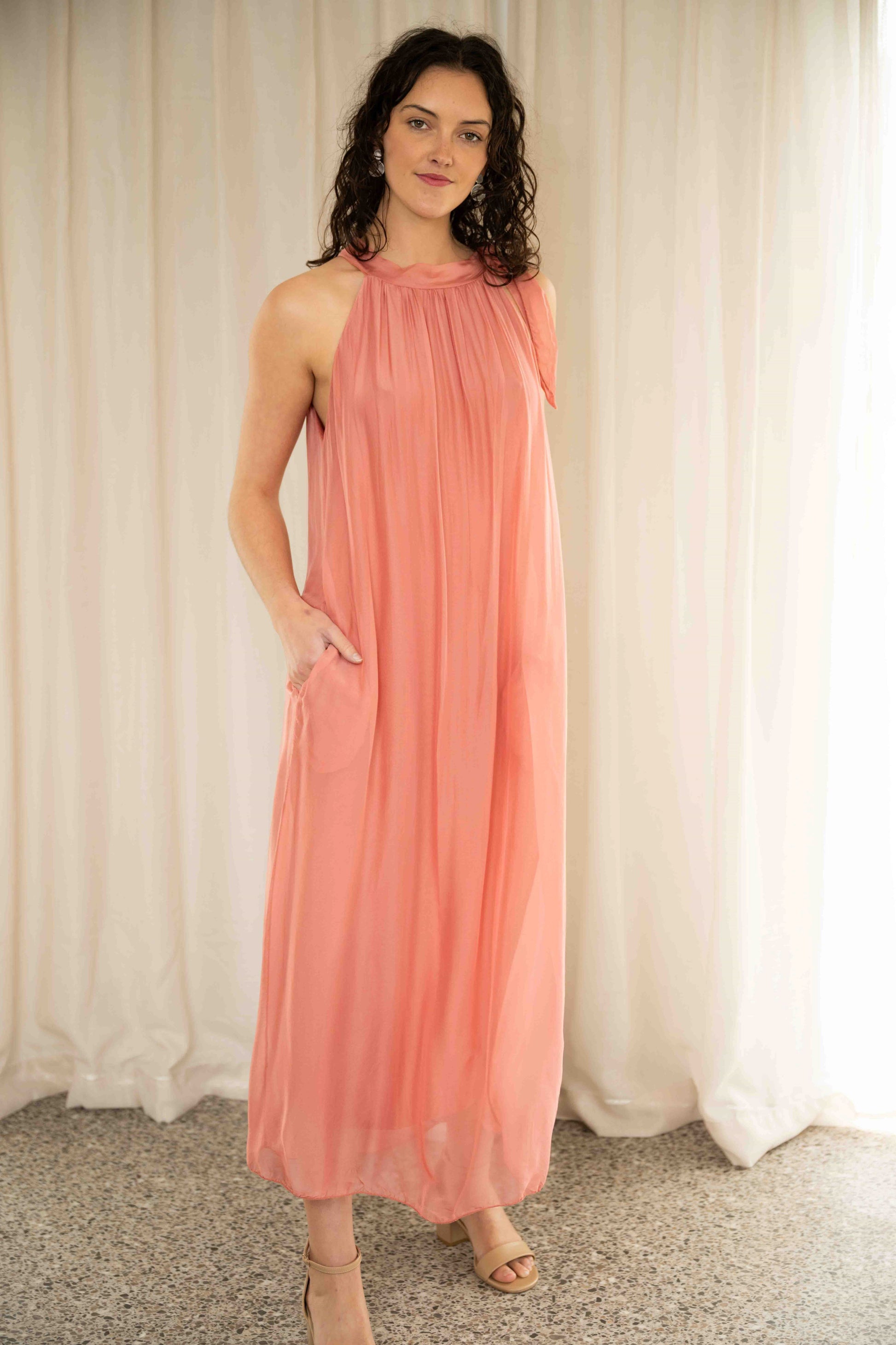 The Madeline Dress in Spice offers a warm, modern twist on a classic silhouette. With its high neckline secured by a soft side bow, this sleeveless design, with pockets, exudes understated elegance with a touch of personality. The A-line cut flatters the figure while allowing for comfortable movement, making it as easy to wear as it is polished.