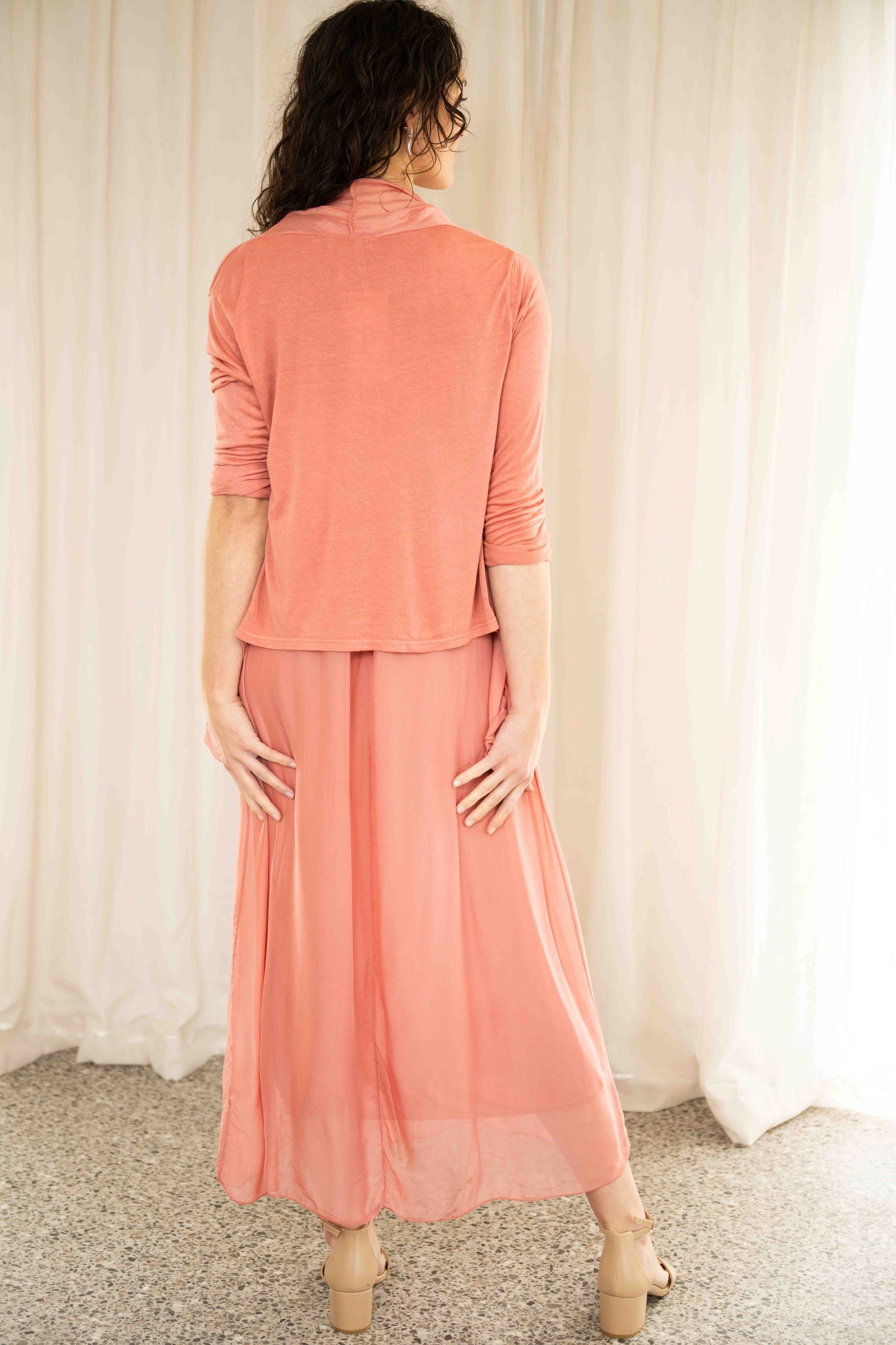 The Melody Jacket in Spice brings warmth and subtle drama to this airy, elegant layer. Made from a blend of viscose, silk, and elastane, it offers a light, breathable feel with a hint of stretch for effortless comfort. Sheer front panels fall longer in the middle, creating soft movement and a fluid, flattering shape.