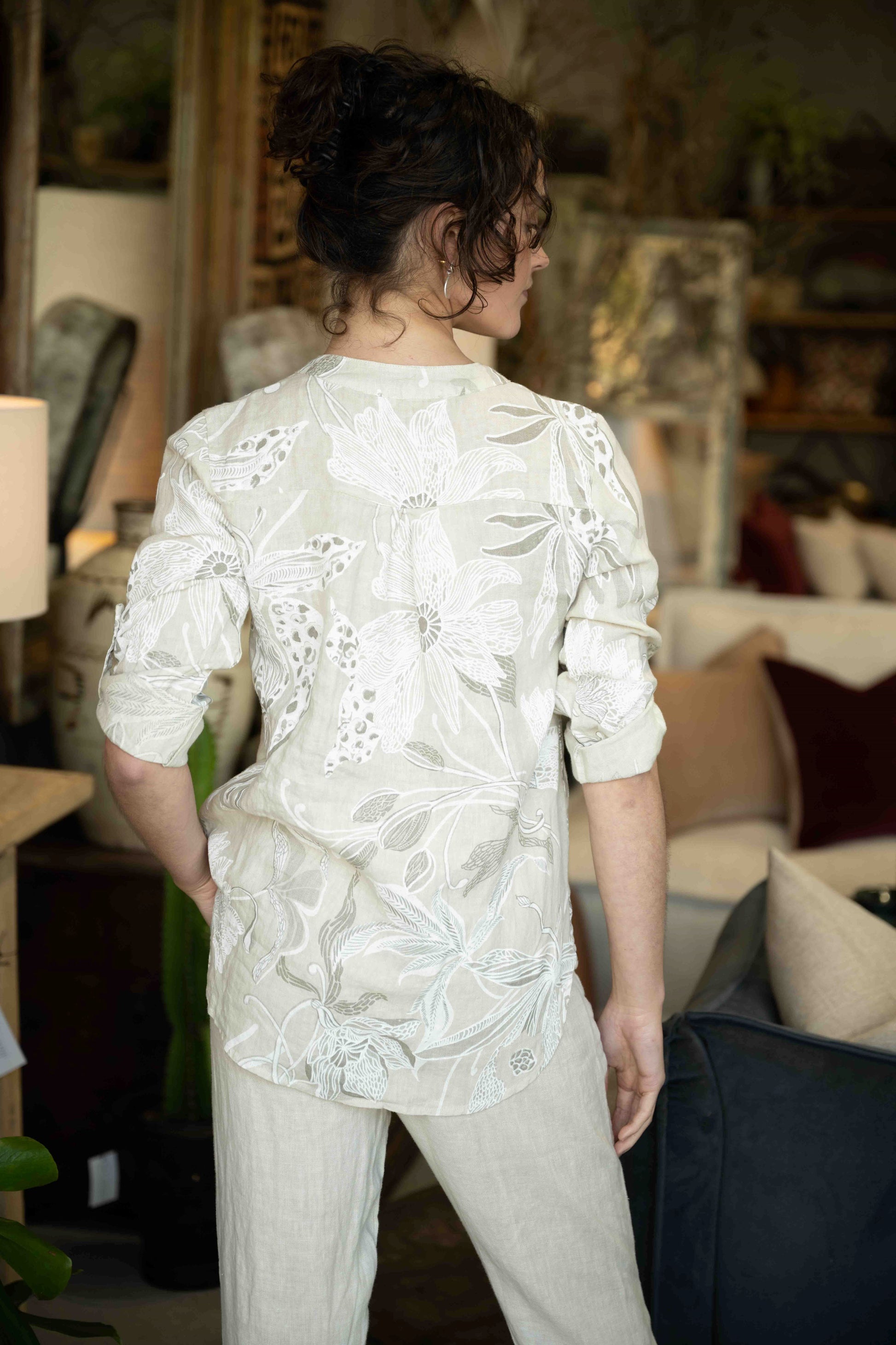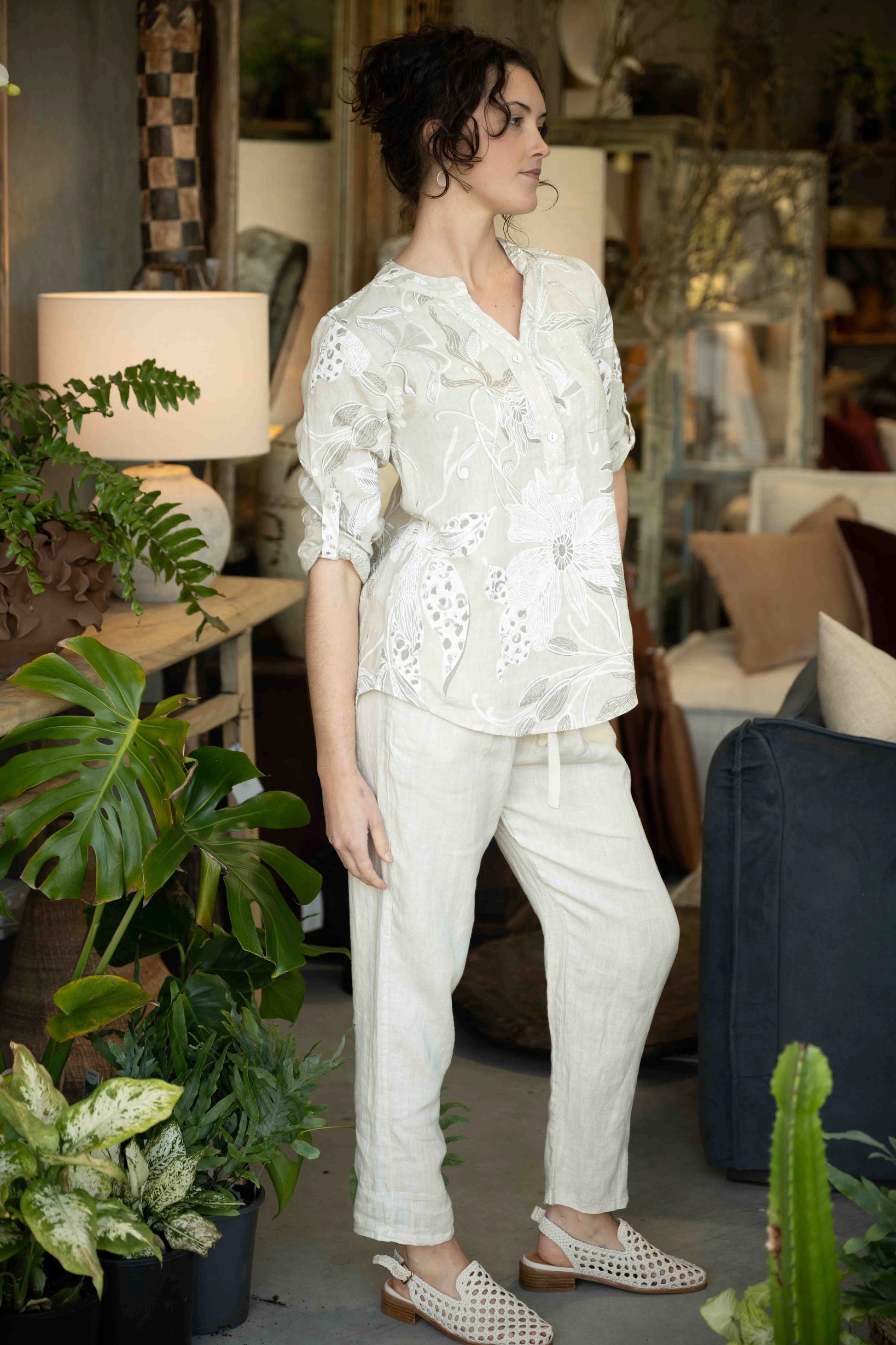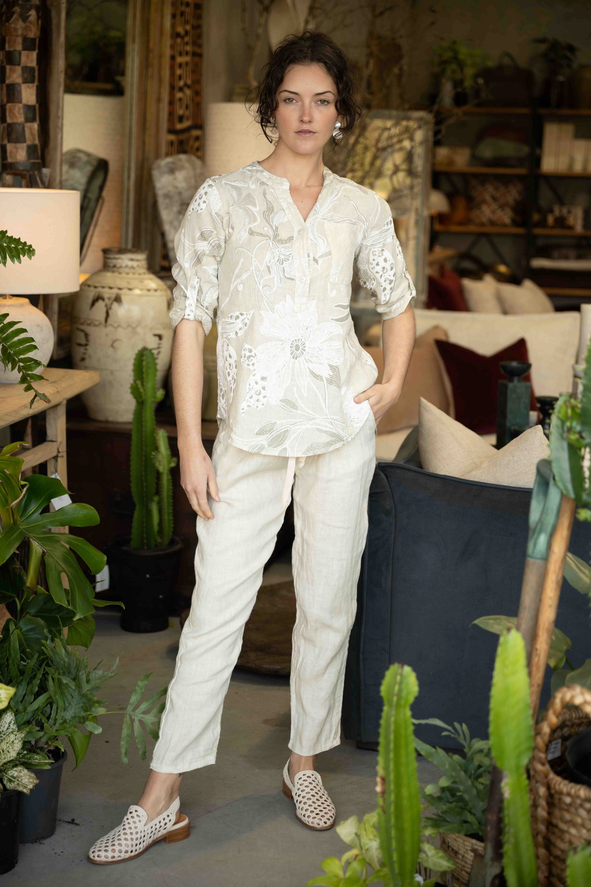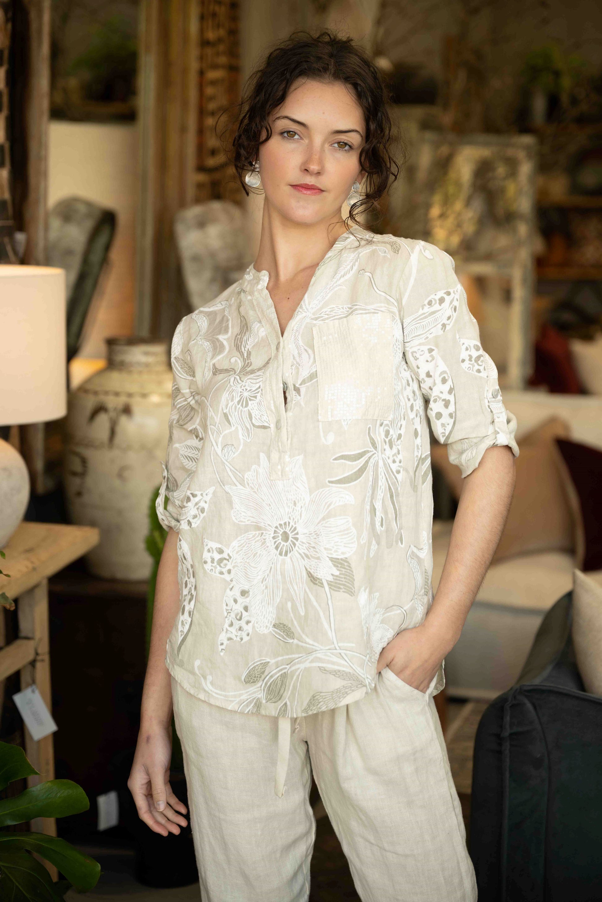 The Rattani Blouse in Beige features a subtle print inspired by natural elements, blending gentle foliage and floral shapes for an understated, elegant look. Crafted in Italy from 100% linen, it offers a lightweight and breathable feel, perfect for warm days or layering with ease. The button-down front is delicately trimmed with sequins, adding a soft shimmer that elevates the blouse’s relaxed silhouette.