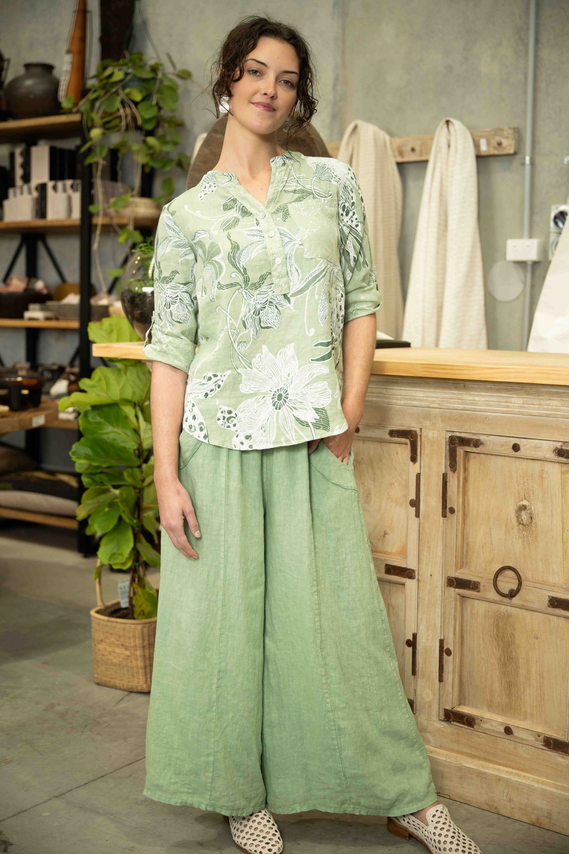 The Rattani Blouse in Green Bay features a subtle print inspired by natural elements, blending soft foliage and floral shapes for an earthy yet refined look. Made in Italy from 100% linen, it offers a breathable, lightweight feel perfect for warmer days or easy layering. The button-down front is accented with delicate sequin trim, adding a touch of shimmer that elevates the relaxed silhouette.