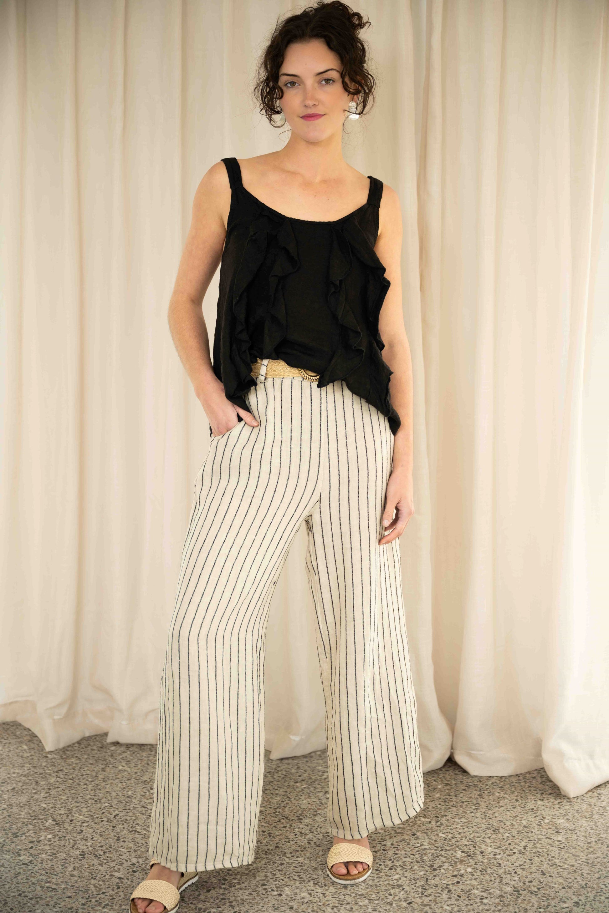 A breezy staple with a romantic twist, the Senidah black linen singlet is designed to keep you cool while elevating your everyday style. Made from 100% Italian linen, it offers a breathable, lightweight feel that’s perfect for warm-weather dressing. The wide straps provide comfortable coverage, while vertical ruffles cascading down the front add soft texture and a playful sense of movement.