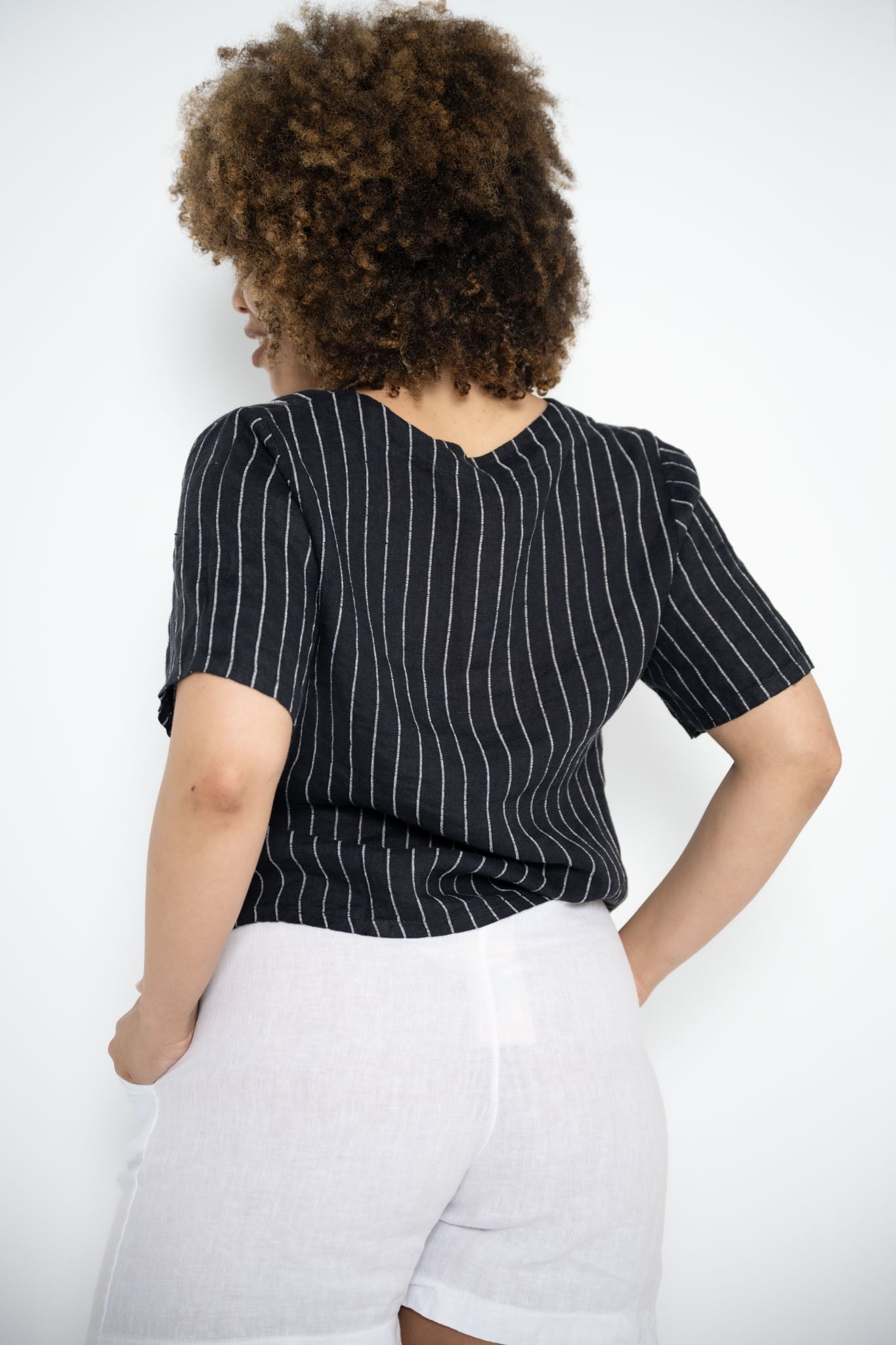 The Sony Jacket in navy brings a polished edge to a relaxed silhouette. Made in Italy from breathable linen, this cropped jacket features fine white pinstripes that add a touch of texture and depth. The short sleeves and open V-neckline create a flattering shape, while the single timber button at the front brings warmth and character to the look.