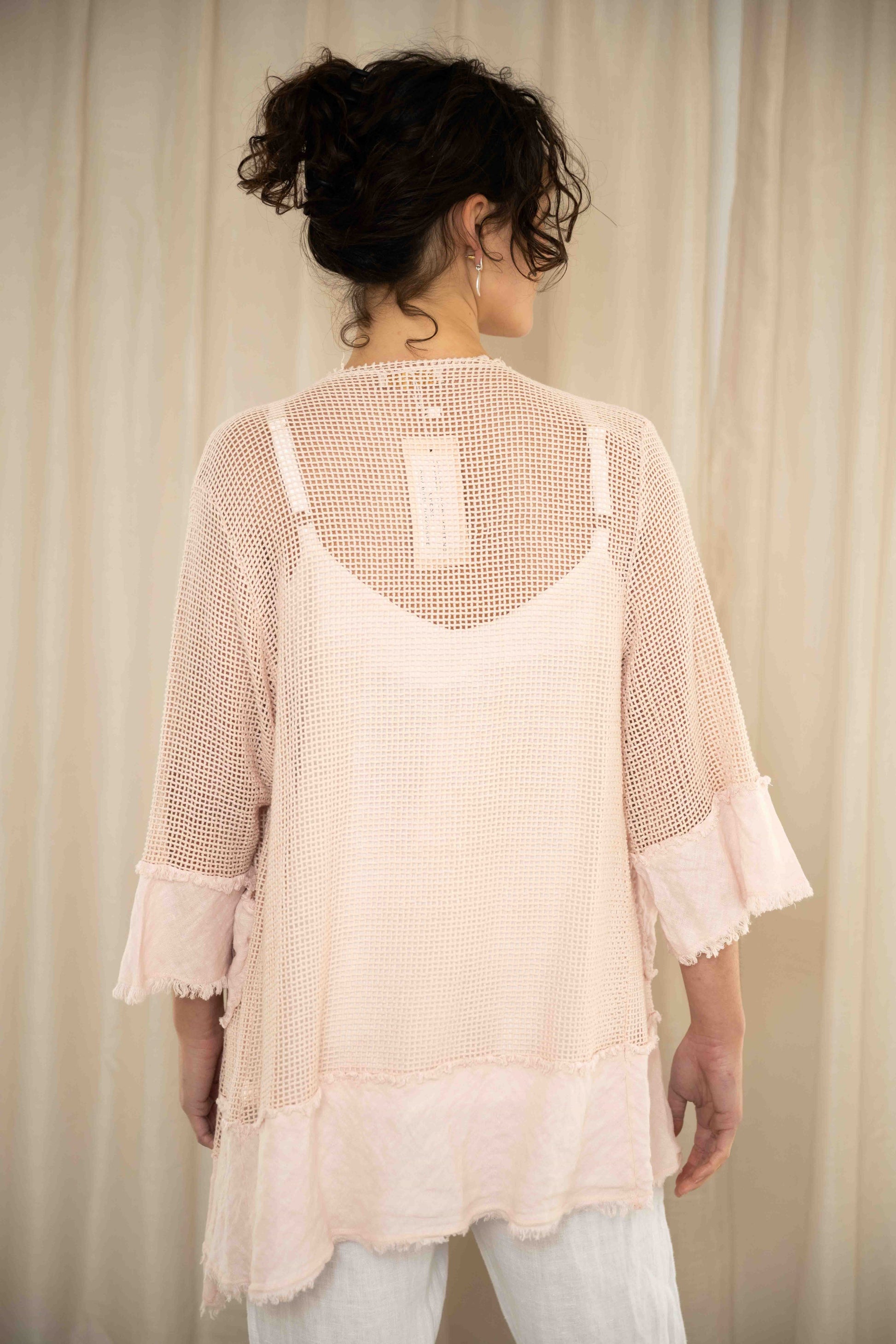 Made from sheer cotton mesh and finished with soft linen trims, this jacket is designed for effortless layering over flowing dresses, camisoles, or wide-leg pants. The gentle blush hue brings a touch of softness and femininity, perfect for lifting neutral outfits or adding a delicate pop of colour.